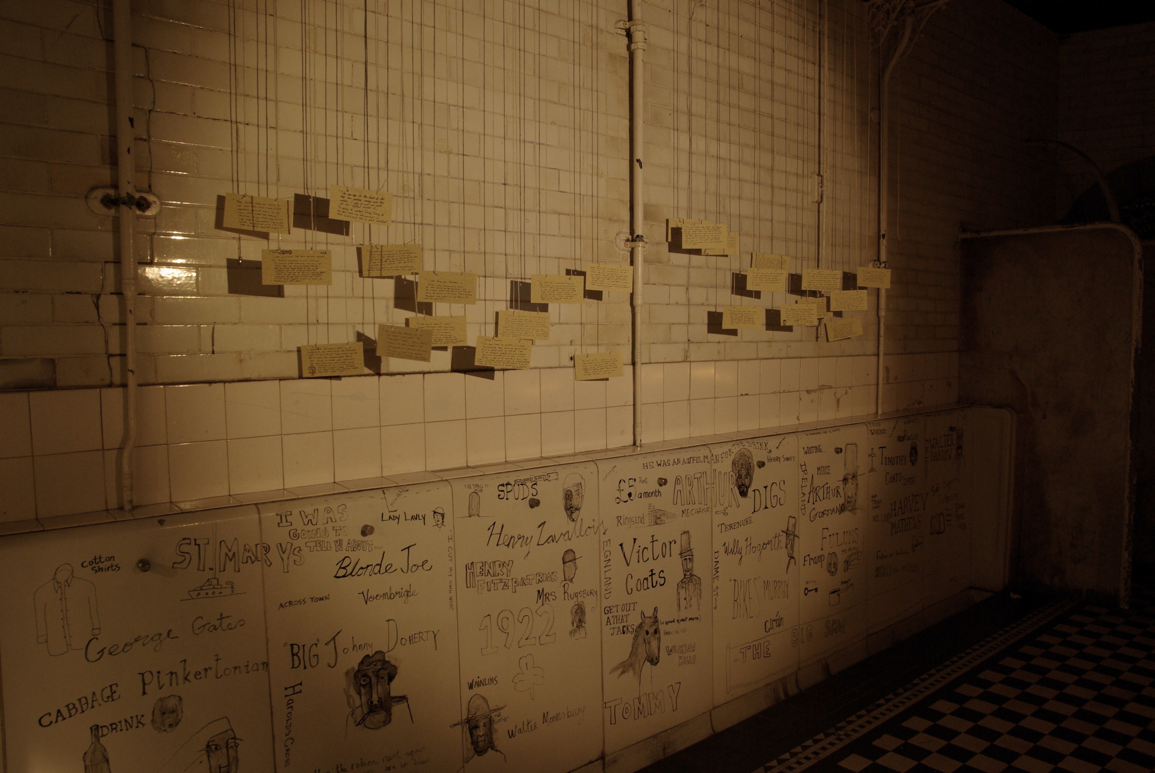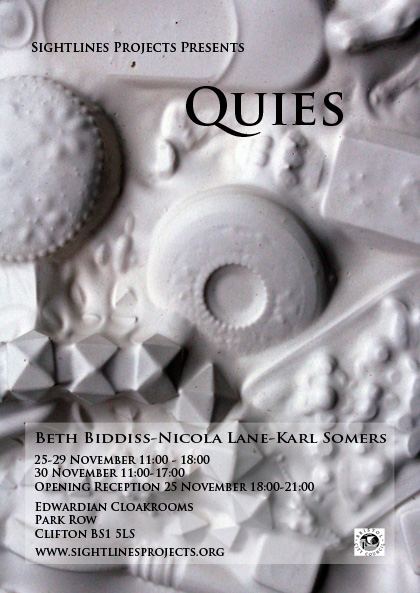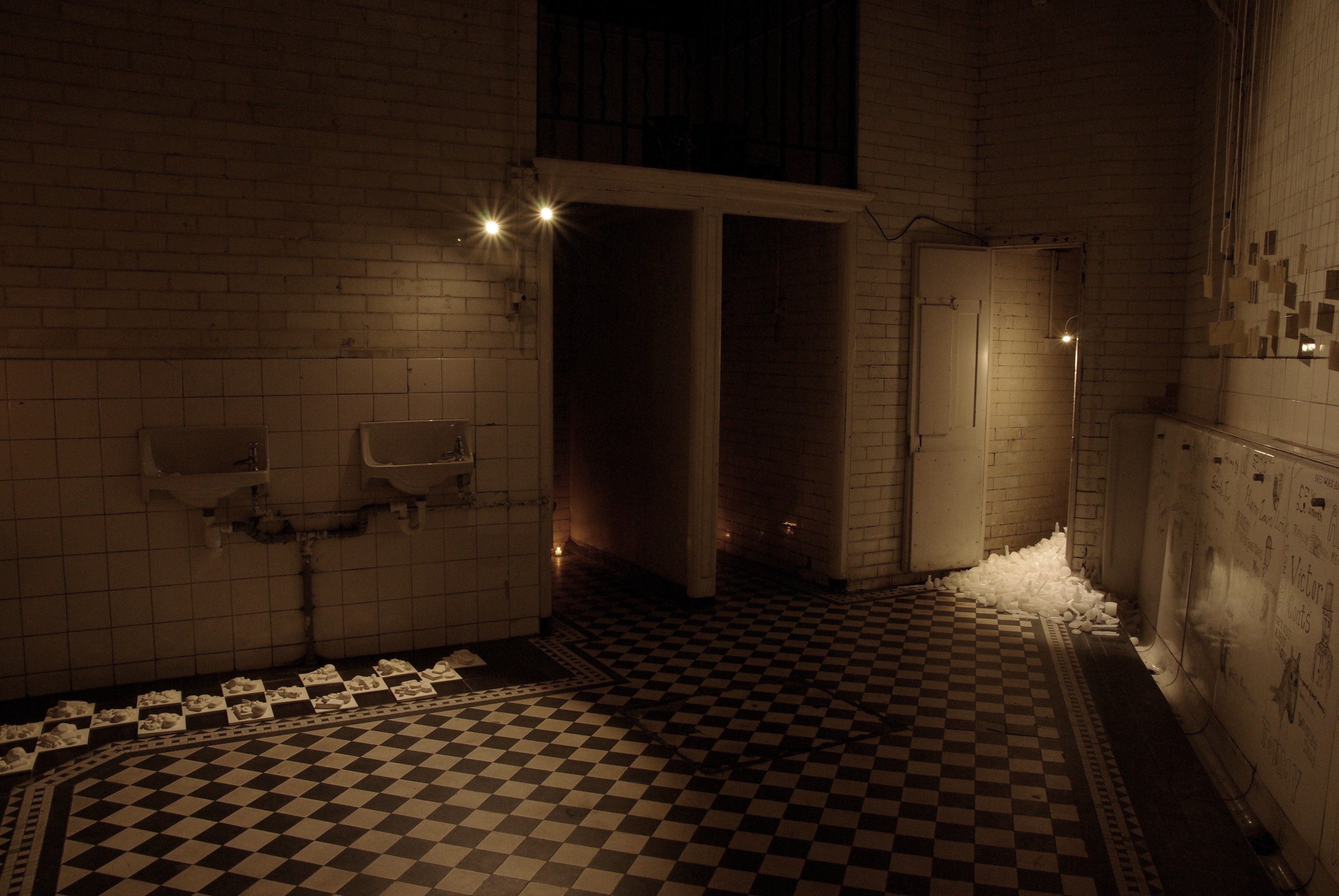 Quies was a site-specific exhibition of work by three multidisciplinary artists who were invited to respond to the physical space and tacit history of Bristol’s Edwardian Cloakrooms. Of particular interest was the fact that the cloakrooms have ‘lain still’ for decades and been left virtually unchanged, as if in a state of limbo or stasis from which they could conceivably return at any given moment.
